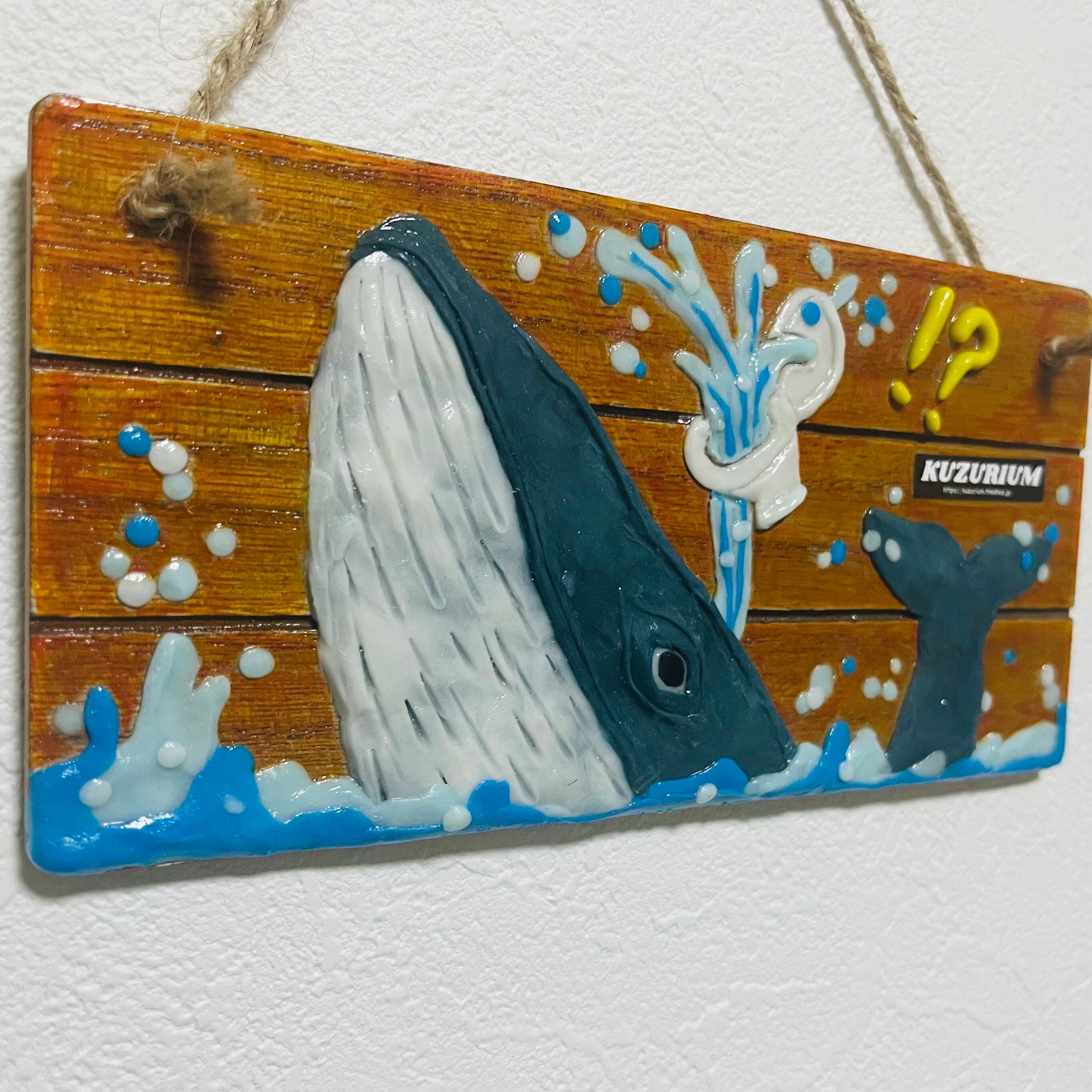 クジラが潮を吹き、トイレが吹っ飛んでいる絵のドアプレートです。トイレのドアにつけてもよし、作品として飾るのもよし。ただ、これを飾ってから万が一、トイレの故障や逆流があったら、その時は水道業者を呼びましょうね。